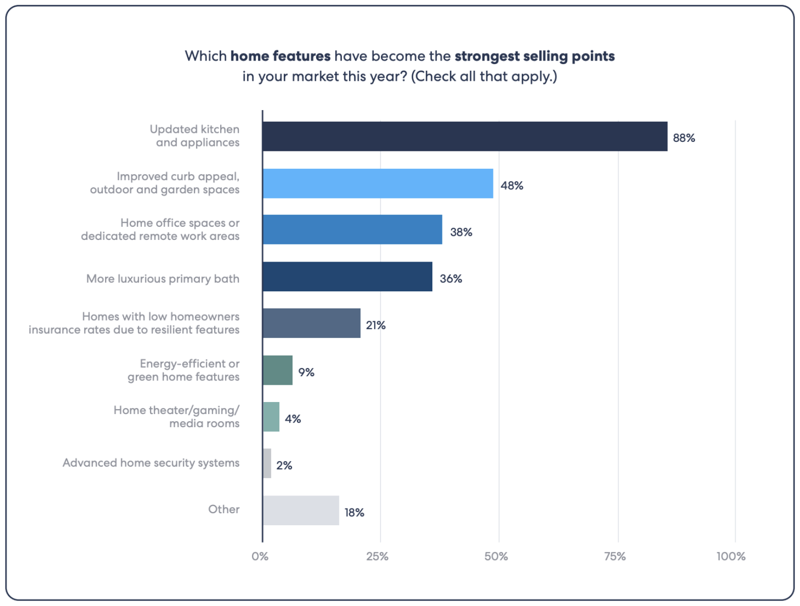 According to Homelight’s “Top Agent Insights End of Year 2024 Report”, “88% of agents say that upgraded kitchens and appliances are one of the best selling points for homes”–a significant increase from the previous year. https://homelightblog.wpengine.com/wp-content/uploads/2024/12/homelight-top-agent-insights-end-of-year-2024-report.pdf