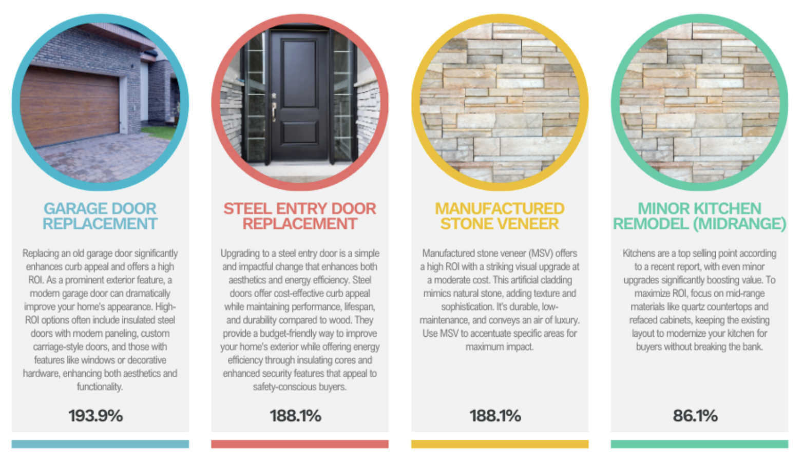 Whether you’re updating your home to sell or simply want to enjoy a more modern space, focusing on high-ROI projects is a smart strategy. From replacing your garage door to enhancing your home’s exterior with stone veneer, these upgrades can boost both your home’s value and appeal.